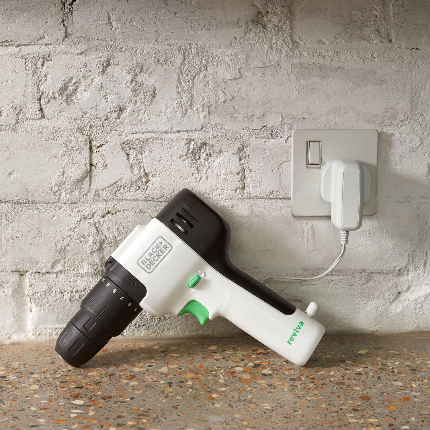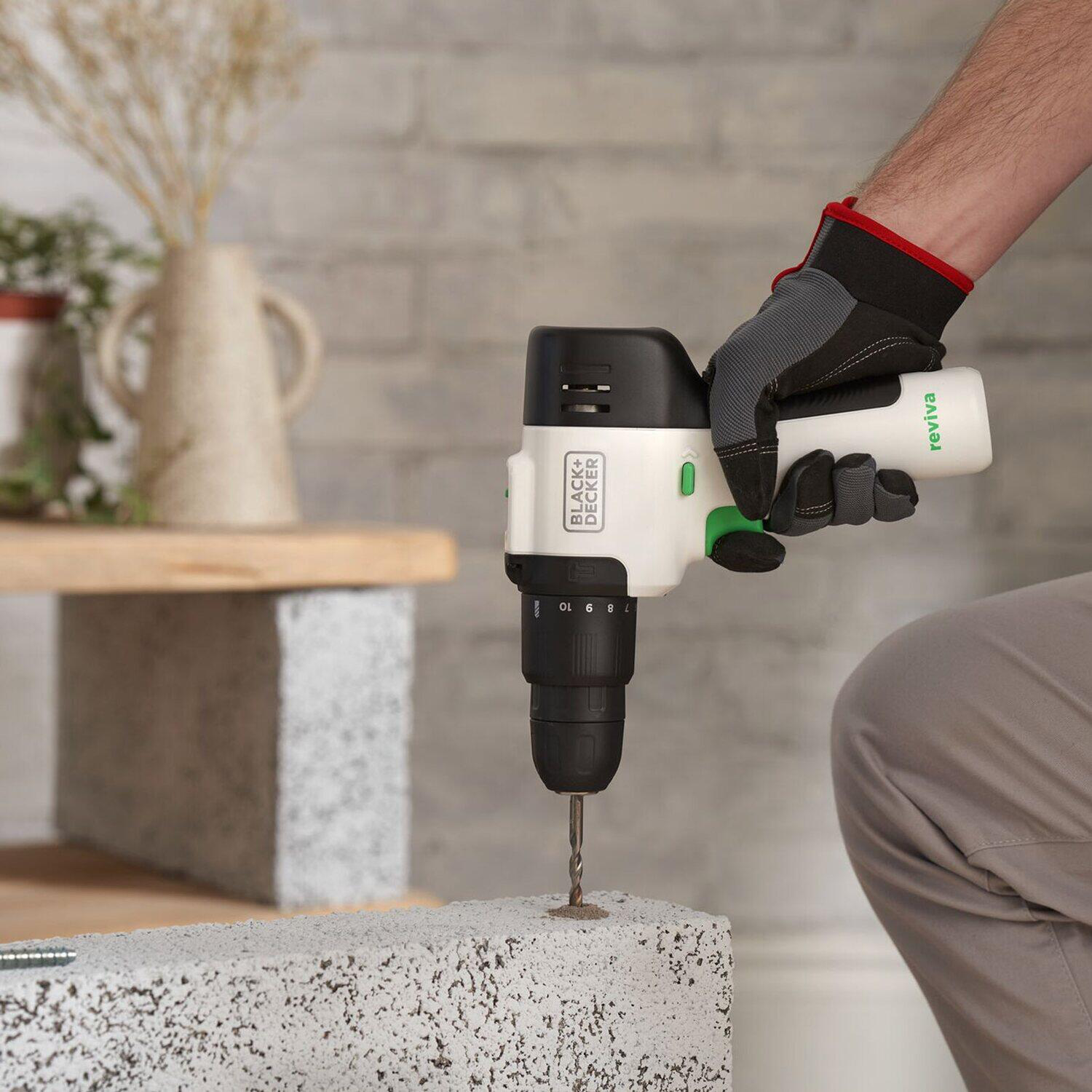 - One BLACK+DECKER reviva™ 12V Cordless Hammer Drill contains an amount of recycled material* equivalent to the weight of 8 0.5L single-use plastic bottles** ** assumes average 0.5L single use bottle weighs 10.3g